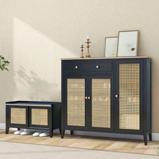 Material: Solid American rubber wood, Kalimantan hand-braided soft-close rattan doors. Gold plated copper handle.