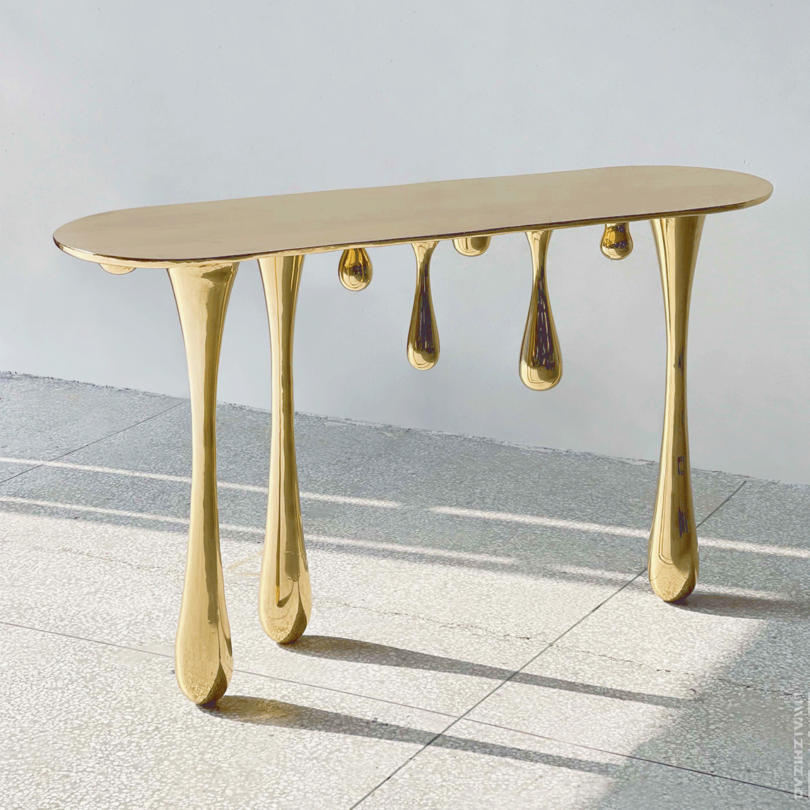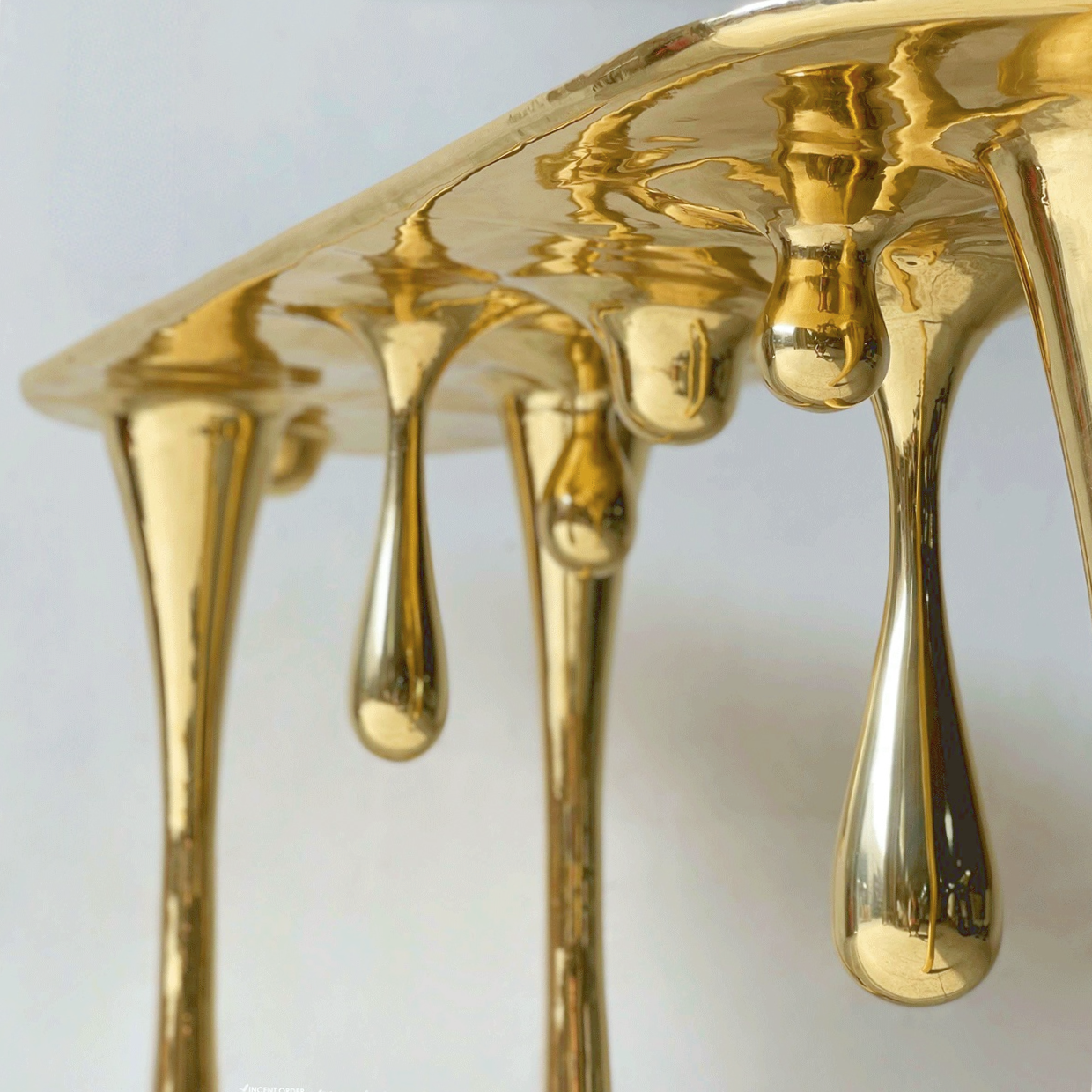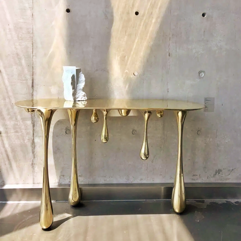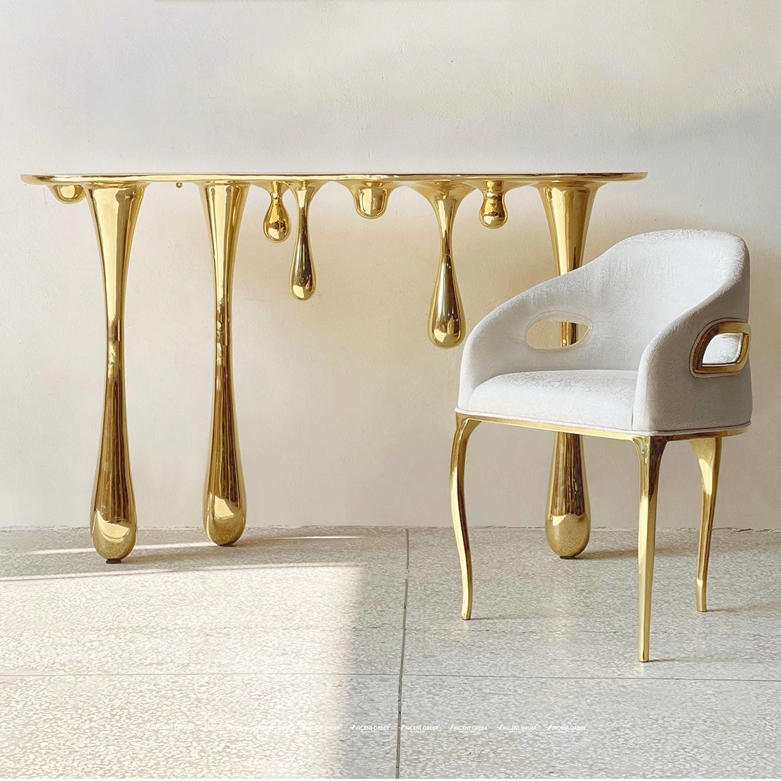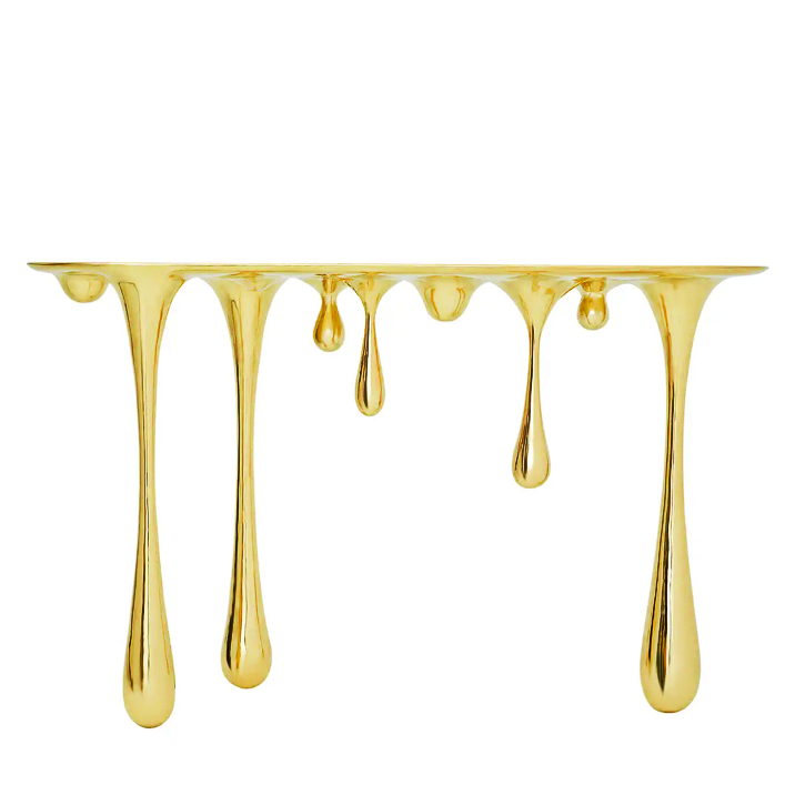Melting, inspired by characters and elements in imagery utopian world, using the abstracted forms of gold, with a slightly surreal quality, while still maintaining their utility as furnishings.